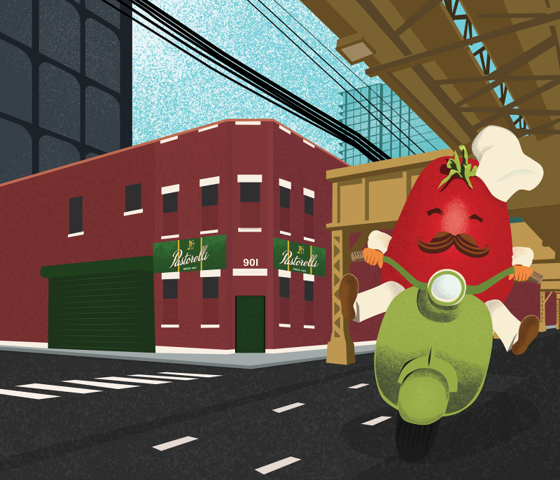 Client asked for a fun illustration of their Neapolitan Chef character by a rendering of their warehouse location.